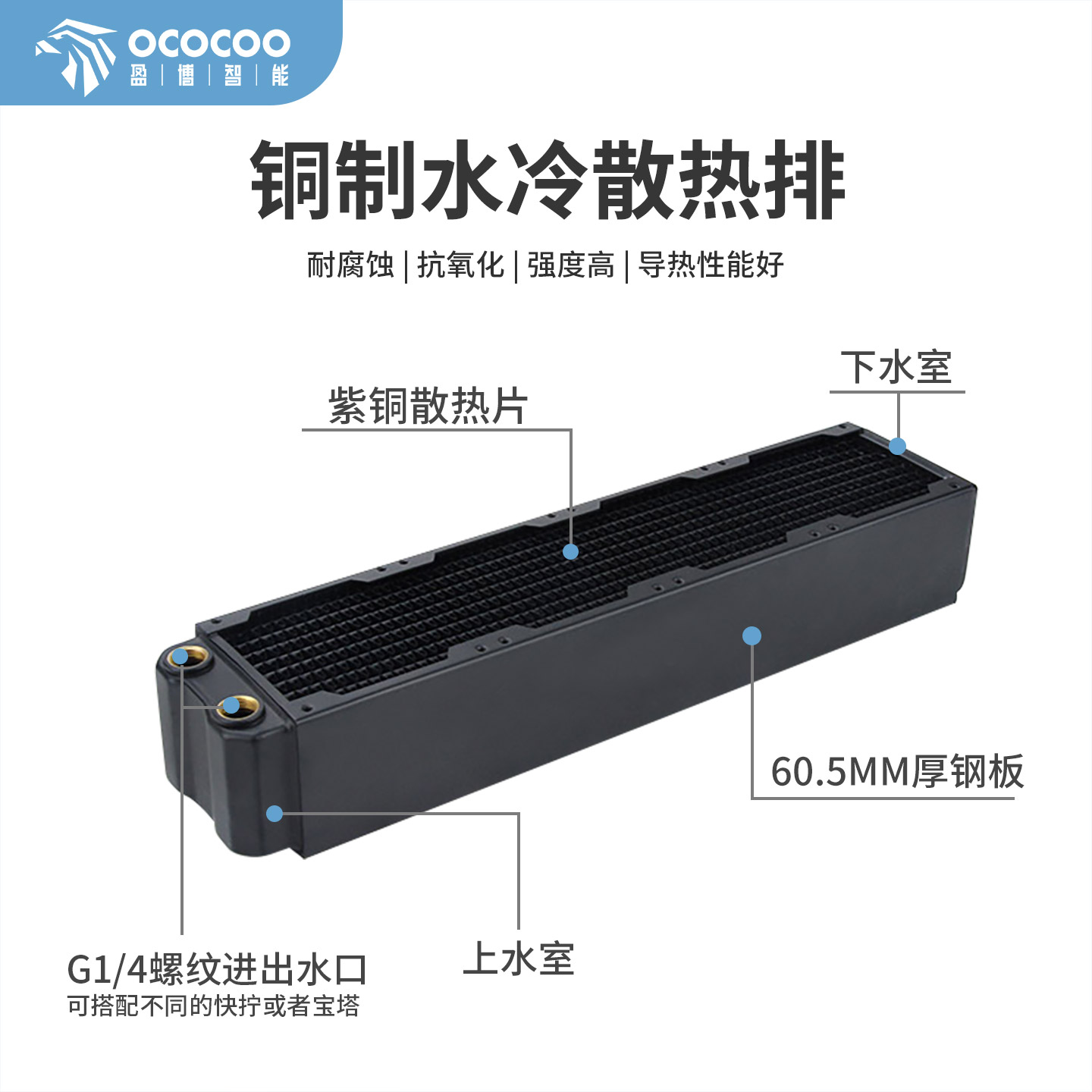 OC-CRT32T适用80风扇*4加厚60.5MM铜排,分为上水室和下水室,紫铜散热片,G1/4螺纹口,可搭配不同的快拧或者宝塔,加厚60.5MM钢板。型号种类齐全满足不同行业需求,高规格材料及结构设计致密紫铜黑化鳍片,细节把控彰显品质,散热排外观简约时尚,具有更良好的通风性能,降低风阻满足用户散热所需。盈博80X4高性能60MM厚铜排水冷排散热排双层1U/2U服务器厚排散热是一款 具有良好性能的散热设备,铜排的采用,保证了散热效果的优良。60MM 的厚度,使得热量可以更加迅速地散发。双层设计,不仅能增加散热面积,更是进一步提升了散热效果。这款散热排适用于1U/2U服务器,正是因为其良好的散热性能,才能在强度的工作环境中保持服务器的稳定运行。盈博80X4采用了水冷排设计,很好地降低了温度。水冷技术不仅能够提高散热效果,还可以降低噪音和能耗,使服务器运行更加稳定。铜排的应用,则进一步增加了散热效率,使热量能够迅速地从服务器中排出。总结而言,盈博80X4高性能60MM厚铜排水冷排散热排双层1U/2U服务器厚排散热是一款性能优良、外观精致的散热设备。无论是在强度的工作环境下,还是在高负荷的服务器应用中,它都能保持服务器的稳定运行和散热效果,值得信赖和选择。