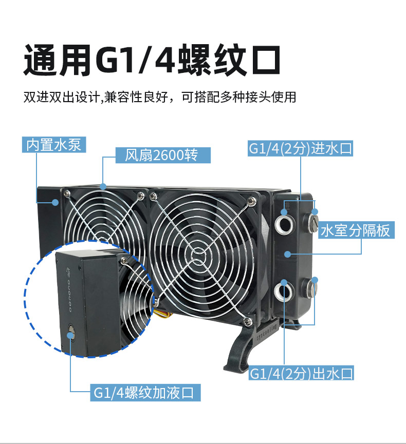 兼容性是水冷部件的重要考量,盈博AP11系列搭载通用G1/4螺纹口,配合双进双出设计,可灵活搭配市面上多种规格的水冷接头、管路及配件。无论是追求简约装机的实用派,还是偏好个性化改造的爱好者,都能根据自身机箱结构、散热需求自由组合配件,无需担忧适配难题,为系统升级预留充足空间。