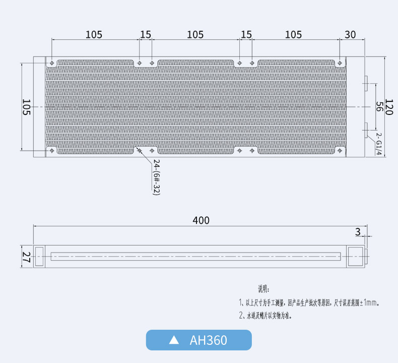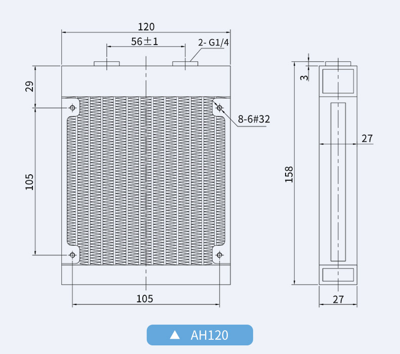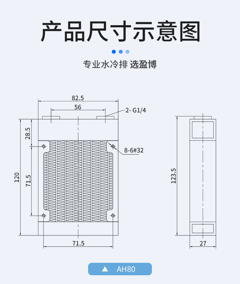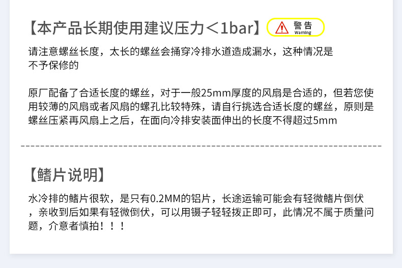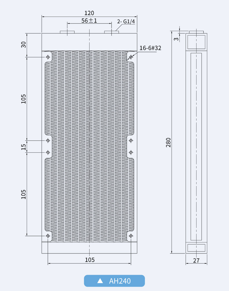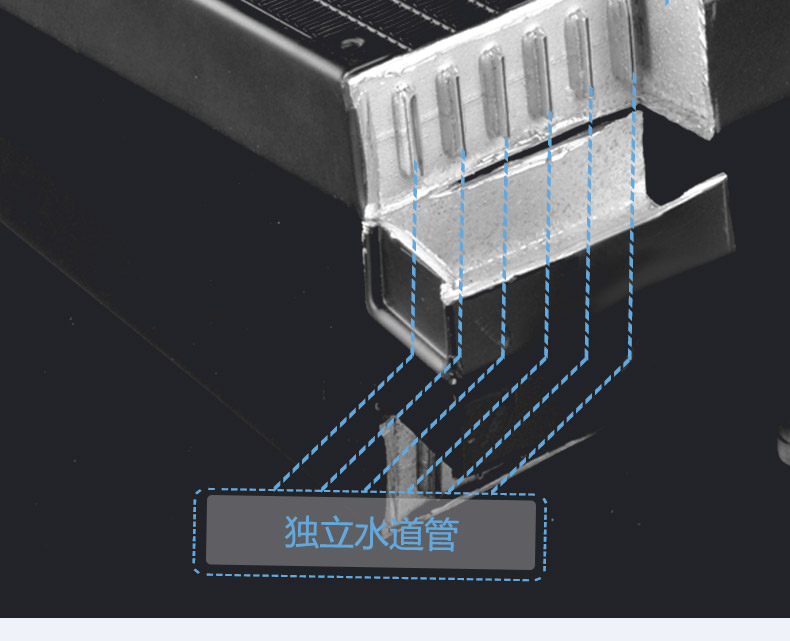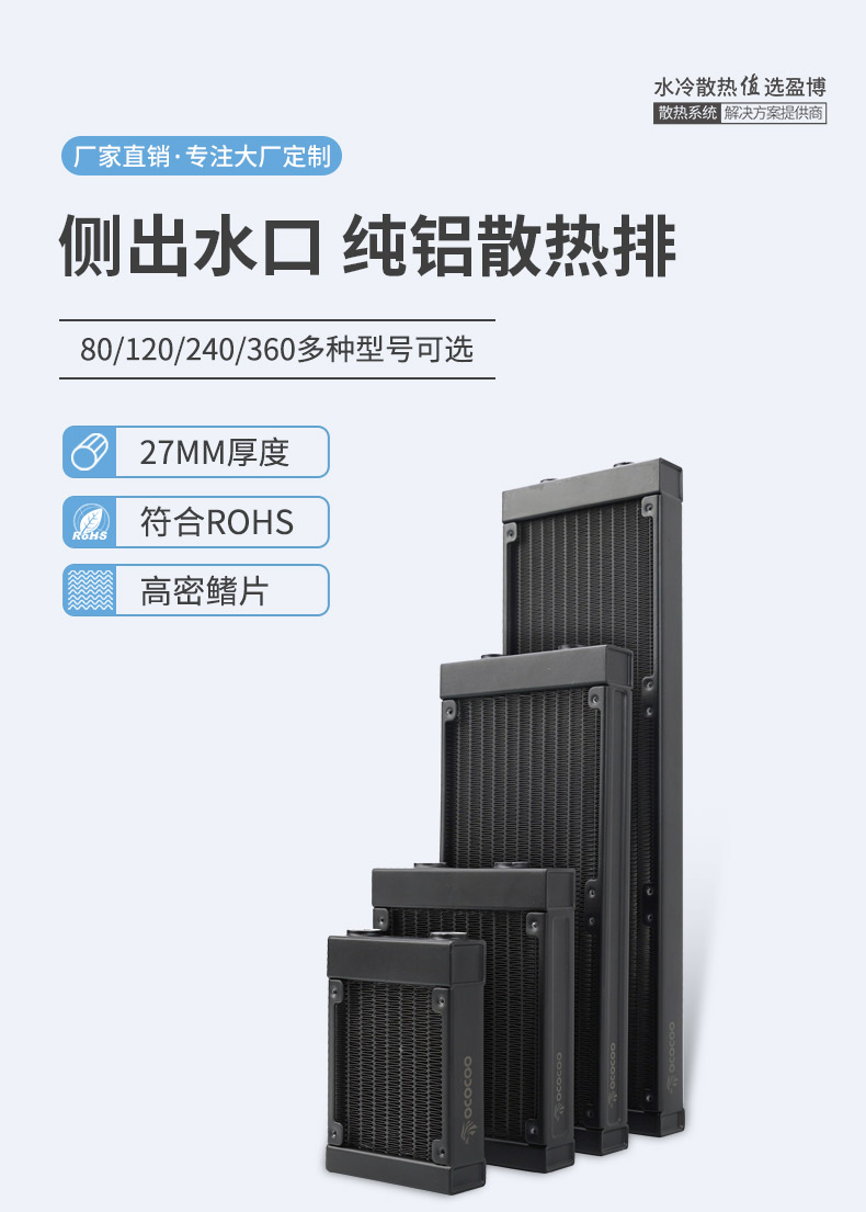 侧出水口纯铝散热排,27mm薄款,符合欧盟RoHS标准,均匀/稳定。12扁水道设计,
