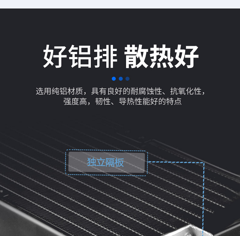 全铝水室,结构稳定 合理防腐 散热均匀 性能耐用 表层工艺,冷排表面采用喷砂